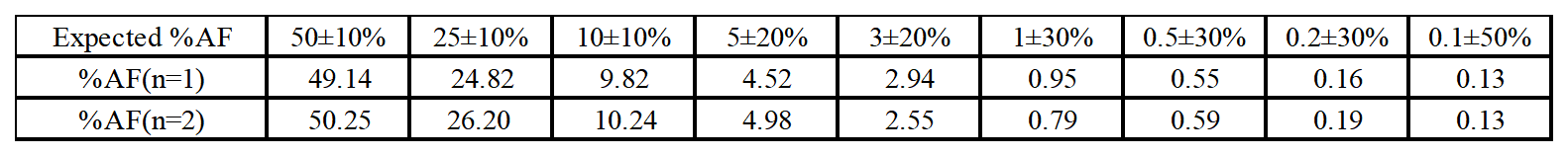 我們可以通過(guò)理論計算來(lái)預測下可能的檢測限范圍。當控制拷貝在15000(對應50ng input)以?xún)葧r(shí)LOB數據是2,2/15000=0.0133%,預測檢測限為0.0200%。