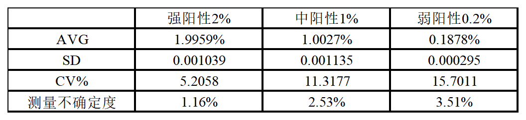 由上數據可見(jiàn):強陽(yáng)性2% 、中陽(yáng)性1% 、弱陽(yáng)性0.2%三種檢測體系下,誤差均在合理的范圍內,精密度良好。