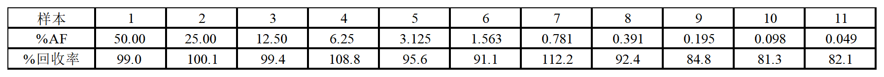 由上數據可見(jiàn):當AF在0.05%-50%范圍內,對應的回收率在80-120%范圍,符合預期。