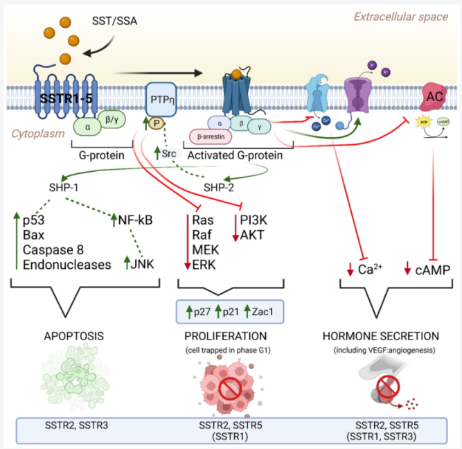 SSTR2與其它同家族受體一樣,在結合內源性多肽配體SST后可以與Gi蛋白偶聯(lián),通過(guò)調節腺苷酸環(huán)化酶活性進(jìn)而抑制環(huán)腺苷酸的合成,將外源信號傳遞至胞內,從而參與調節多種激素的分泌,抑制細胞生長(cháng)增殖。SSTR還能激活K通道,促進(jìn)細胞膜超極化,抑制門(mén)控Ca2+通道的激活,進(jìn)而阻礙Ca2+內流,抑制胞吐,抑制荷爾蒙的分泌功能。當SSTR2或其它亞型與SST結合后,可以通過(guò)蛋白酪氨酸磷酸途徑,SSTR導致蛋白酪氨酸磷酸酶(PTP)上調,使酪氨酸激酶去磷酸化而失活,并抑制促絲裂原活化蛋白激酶(MAPK)等多種蛋白激酶,抑制癌基因、c-fos、c-mys、c-jun等轉錄激活,從而抑制DNA和蛋白質(zhì)的合成。