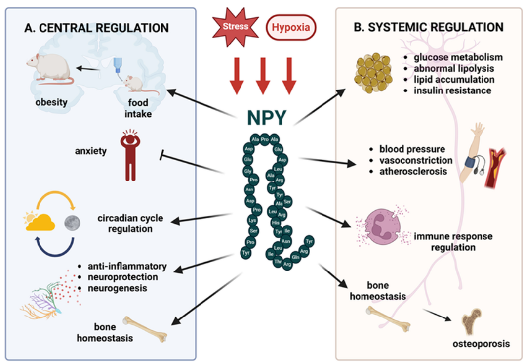 在人類(lèi)中,NPY主要通過(guò)三種GPCR- Y1R、Y2R和Y5R起作用。Y1R需要全長(cháng)NPY1-36才能激活,而Y2R和Y5R也可以結合NPY3-36。所有NPY受體通過(guò)Gi/o蛋白發(fā)出信號,并通過(guò)腺苷酸環(huán)化酶抑制cAMP合成,從而阻斷PKA對下游通路的抑制作用。NPY信號傳導的第二種機制是針對Y1R和Y2R的,涉及Ca 2 +的動(dòng)員以及隨后PKC和CaMKII的鈣依賴(lài)性激活。同時(shí),這些信號通路導致ERK1/2的激活。此外,所有NPY受體都能夠激活PI3K/Akt通路。Y5R的具體特征是能夠激活RhoA,從而調節細胞骨架重塑。