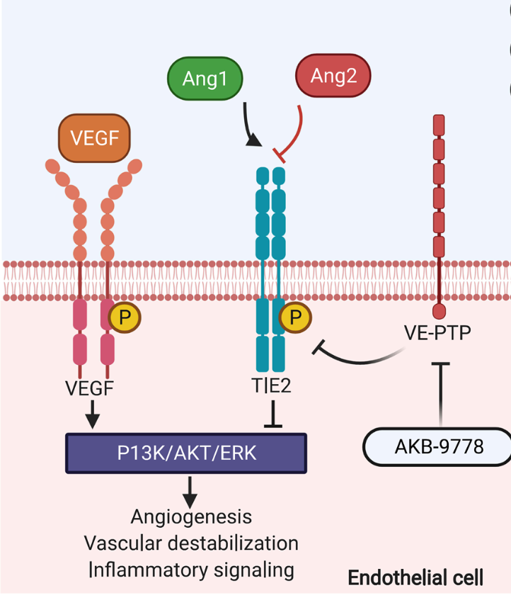 血管生成素蛋白家族由 血管生成素1(Ang1)、血管生成素2(Ang2)、血管生成素3(Ang3) 和血管生成素4(Ang4) 組成。Ang1和Ang2是Tie2的主要配體,Tie2是一種內皮細胞特異性受體酪氨酸激酶。Tie2在血管生成素激活后經(jīng)歷特異性亞細胞定位。這種定位有助于區分靜止內皮和血管生成內皮之間的信號轉導結果。在運動(dòng)的血管生成內皮中,基質(zhì)結合的Ang1與Tie2結合并將其定位于細胞-細胞外基質(zhì)接觸,并繼續進(jìn)行細胞遷移和增殖過(guò)程。在靜止內皮中,Ang1/Tie2 信號轉導將匯合內皮細胞上的Tie2轉位到內皮細胞-內皮細胞連接處的簇中,并誘導促存活、內皮緊密連接穩定和抗炎信號。這主要是通過(guò)下游募集和激活PI3K以及隨后的Akt磷酸化來(lái)實(shí)現的。Akt信號轉導通過(guò)上調促存活分子(包括磷酸化內皮一氧化氮合酶(eNOS) 和存活素表達)來(lái)促進(jìn)內皮細胞存活,同時(shí)抑制凋亡途徑,例如 caspase-9 和 B 細胞淋巴瘤 2 (BCL2) 相關(guān)細胞死亡激動(dòng)劑 (BAD)。