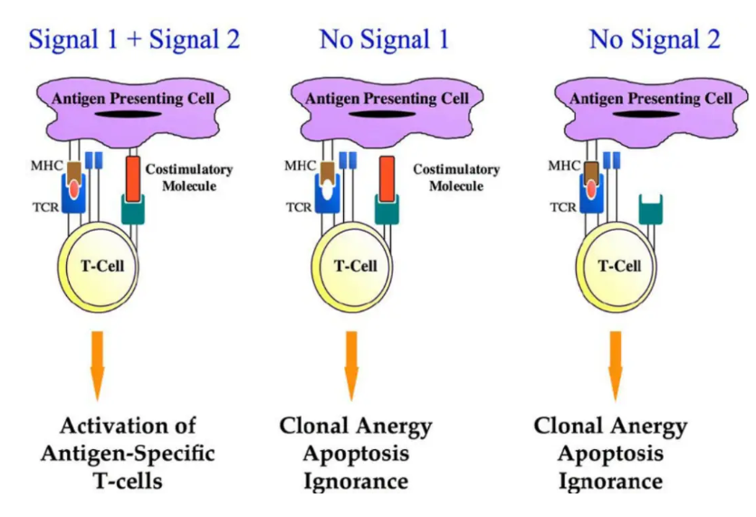 但僅有信號1無(wú)法有效激活T細胞的免疫反應,還需要足夠的共刺激信號(信號2)。信號2不是抗原特異性的,而是通過(guò)抗原呈遞細胞上表達的共刺激信號分子和T細胞的相互作用而實(shí)現的。共刺激信號對于T細胞的增殖,分化和存活是必要的。如果沒(méi)有共刺激信號,可能會(huì )出現T細胞無(wú)應答/應答低下,細胞死亡或者會(huì )有免疫耐受的情況。