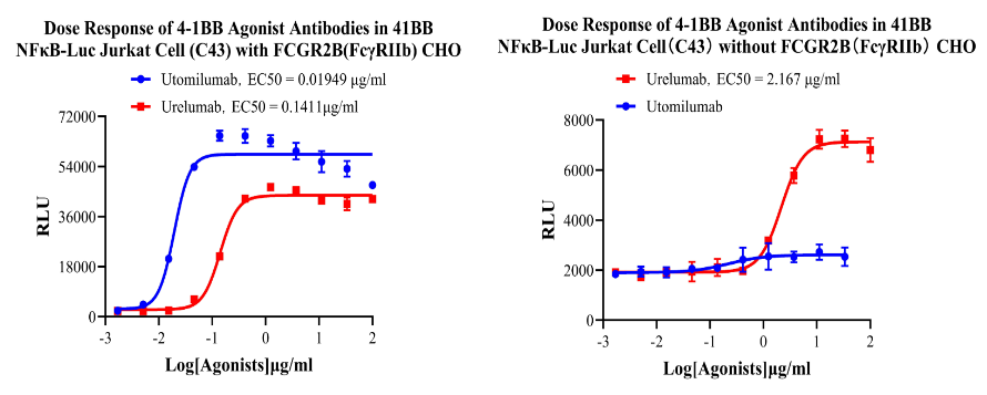 Figure 9. Dose Response of 4-1BB Agonist Antibodies in 41BB NFκB-Luc Jurkat Cell(C43) with/without FCGR2B(FcγRIIb) CHO.