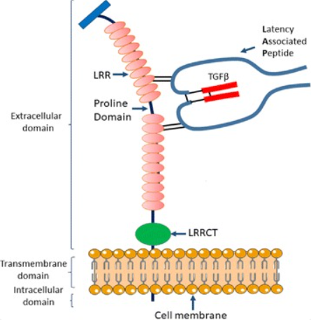 GARP 基因位于人類染色體 9q34.3,GARP蛋白(也稱為 LRRC32)是一種約78 kDa的 I 型跨膜蛋白,由 662 個(gè)氨基酸組成,屬于亮氨酸富集重復(fù)序列(LRR)家族。GARP蛋白根據(jù)其一級序列在結(jié)構(gòu)上分為三個(gè)結(jié)構(gòu)域:細(xì)胞外結(jié)構(gòu)域、跨膜結(jié)構(gòu)域和細(xì)胞內(nèi)結(jié)構(gòu)域。細(xì)胞外結(jié)構(gòu)域包含兩組 10 個(gè) LRR,由一個(gè)富含脯氨酸的結(jié)構(gòu)域和一個(gè) C 端 LRR (LRRCT) 分隔。兩個(gè)保守的Cys殘基(Cys-192和Cys-331)分別位于第7和第12個(gè)LRR,負(fù)責(zé)潛在TGF-β的GARP和LAP的Cys-4之間形成兩個(gè)二硫鍵。