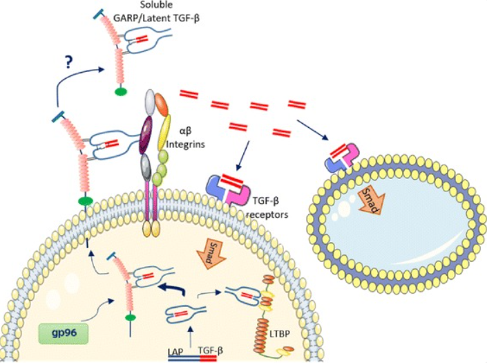 LTGF-β 是前體 TGF-β(pro-TGF-β)與潛伏相關(guān)肽(LAP)形成的復(fù)合物,TGF-β以無活性的同源二聚體前體蛋白形式合成,經(jīng)由類似于弗林蛋白酶的蛋白酶切割后形成LTGF-β 。GARP 能增強(qiáng)弗林蛋白酶依賴性切割,并與LTGF-β 結(jié)合。內(nèi)質(zhì)網(wǎng)腔內(nèi)的主要伴侶蛋白 gp96 確保 GARP 的正確折疊及其在細(xì)胞表面的表達(dá)。在細(xì)胞表面,GARP/LTGF-β復(fù)合物與α-β整合素(αVβ6 和αVβ8)結(jié)合,釋放成熟的 TGF-β 肽。成熟的 TGF-β 以自分泌和旁分泌的方式與細(xì)胞表面的 TGF-β 受體相互作用。在某些情況下,GARP/LTGF-β復(fù)合物也可以從細(xì)胞表面釋放,但如何從可溶性復(fù)合物中激活 TGF-β 尚不清楚。