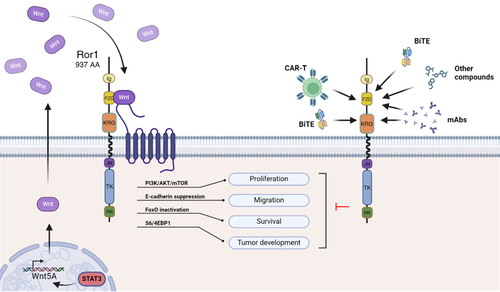 CD200(也稱(chēng)為OX-2)是Ig超家族(IgSF)中的一員,該家族蛋白與B7家族蛋白結構相似, 它包含兩個(gè)胞外免疫球蛋白結構域和一個(gè)小的19個(gè)氨基酸的胞內結構域,沒(méi)有已知的信號基序。CD200在多種正常組織中表達,其中包括B淋巴細胞和活化的T淋巴細胞等免疫細胞。近年來(lái)的研究表明,CD200也在多種人類(lèi)癌癥細胞中存在過(guò)度表達,其中包括人類(lèi)黑色素瘤、卵巢癌、腦膠質(zhì)瘤、髓系白血病、以及一些B細胞惡性腫瘤和大多數內分泌惡性腫瘤(如小細胞肺癌等)。而CD200R作為CD200的同源配體,也是一種IgSF蛋白,在小鼠和人類(lèi)中,CD200R的表達模式相似,均在巨噬細胞、中性粒細胞和肥大細胞中高表達。與大多數IgSF受體不同,CD200R缺乏ITIM結構域,然而,它的67個(gè)氨基酸組成的細胞質(zhì)尾部含有三個(gè)酪氨酸殘基,第三個(gè)酪氨酸殘留位于NPXY基序內,該基序在CD200R結合配體后會(huì )被磷酸化,這導致其并不直接招募SHP1,SHP2等蛋白質(zhì)酪氨酸磷酸酶或磷酸化后的肌醇磷酸酶(SHIP),而是招募酪氨酸激酶下游銜接蛋白Dok-2和1,然后再與RasGAP和SHIP結合。在巨噬細胞和肥大細胞中,這種級聯(lián)反應已被證明可以抑制ERK、P38和JNK的磷酸化,并抑制髓細胞的活化。盡管CD200R表達主要在巨噬細胞和中性粒細胞中發(fā)現,但進(jìn)一步的研究表明,樹(shù)突狀細胞(DC)和一些T細胞亞群中也存在CD200R的表達,這提示CD200R信號在這些細胞類(lèi)型中可能也具有調節功能。