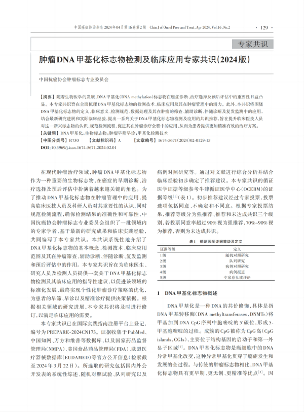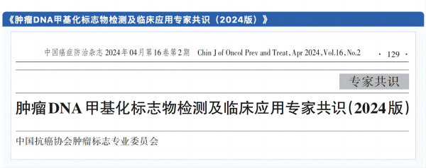 2024年4月,《腫瘤DNA甲基化標志物檢測及臨床應用專(zhuān)家共識》于中國癌癥防治雜志重磅發(fā)布。